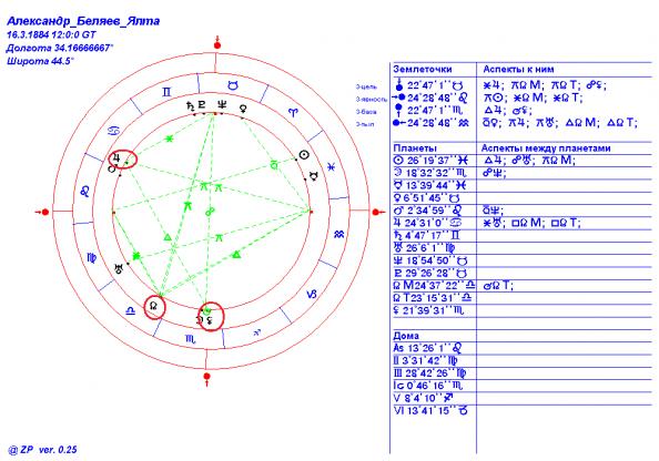 В городе, где А. Беляев «родился» как писатель-фантаст – Москве – отличный «щит» из Урана, Солнца и Юпитера. Плюс квадрат Плутона к ЗемлеЯвности.
